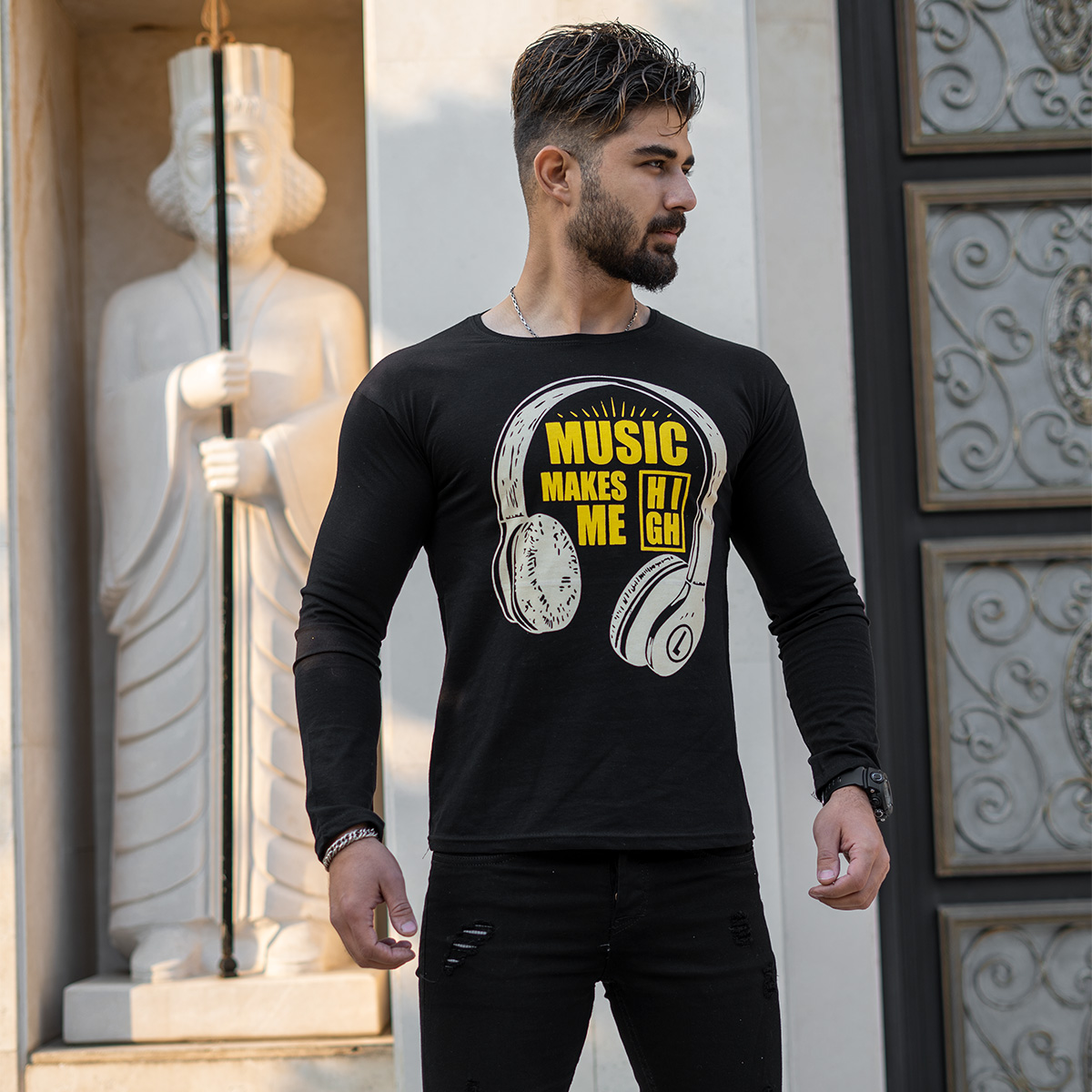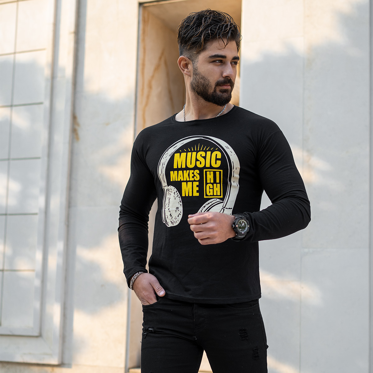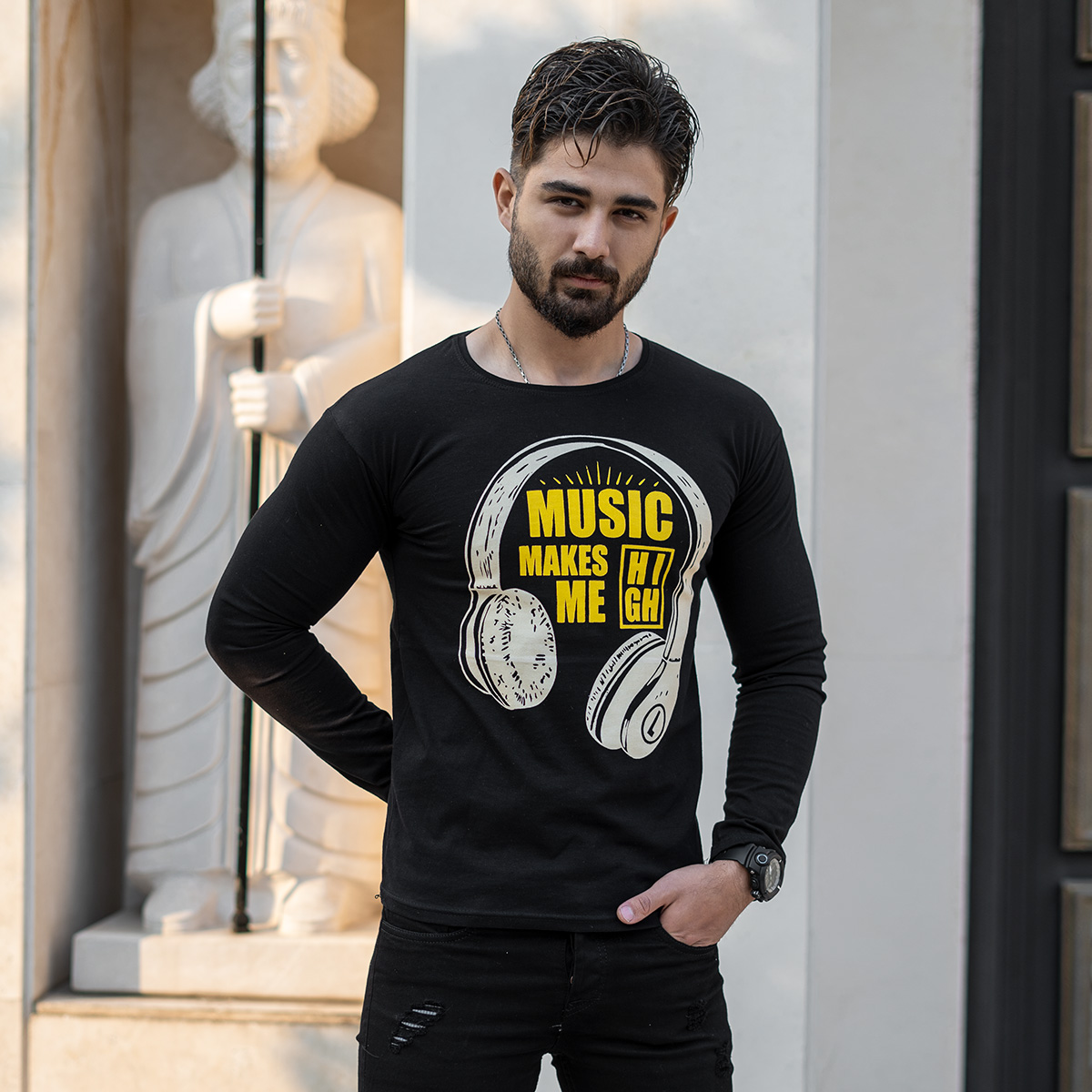 تیشرت آستین بلند مردانه طرح هدست مشکی مدل O22