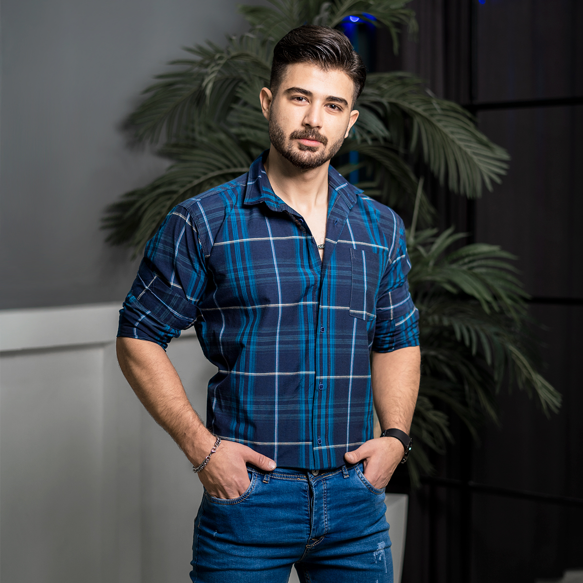 پیراهن مردانه چهارخونه سرمه ای آبی مدل stok