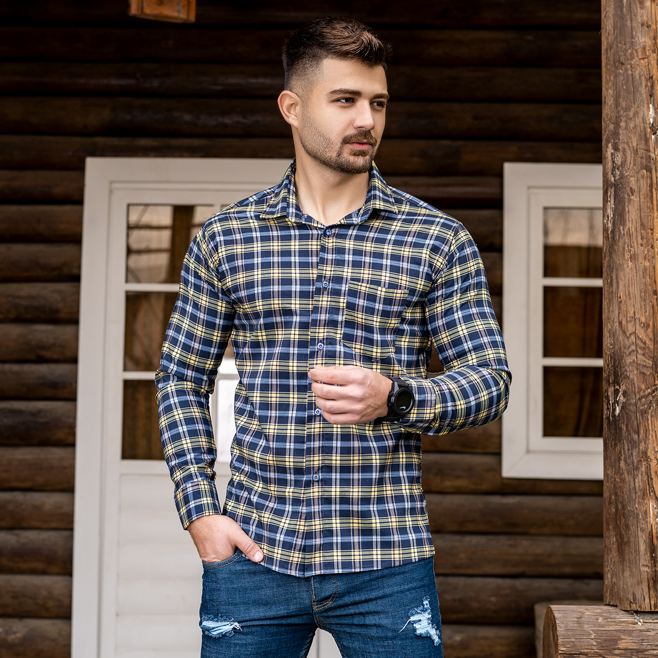 پیراهن چهارخانه زرد سرمه ای مردانه مدلDivan