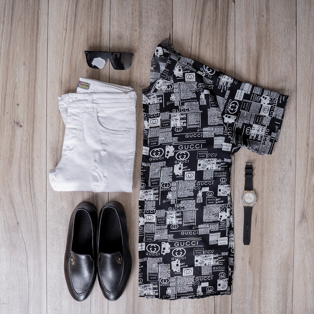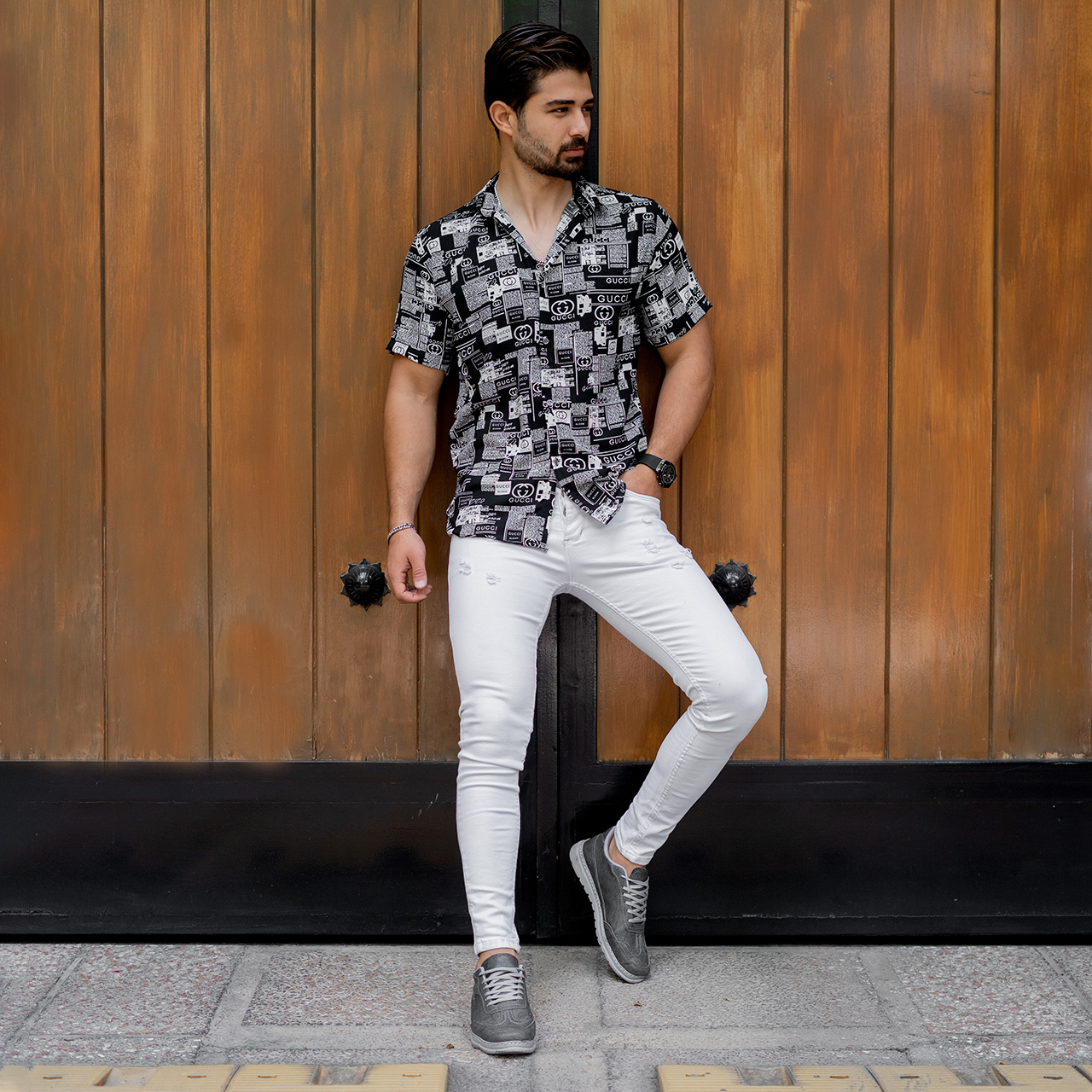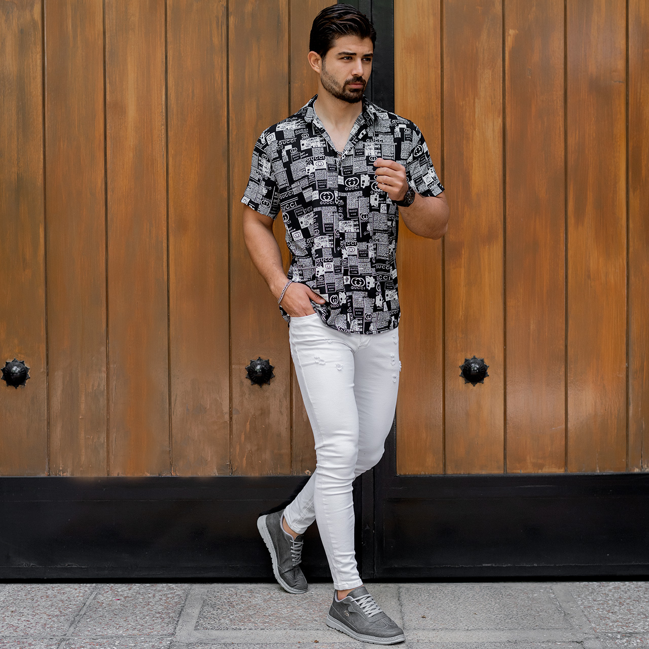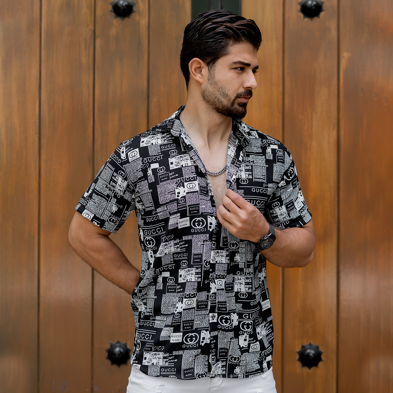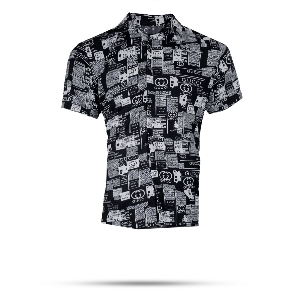 پیراهن هاوایی طرح نوشته مشکی مردانه مدل Gucci